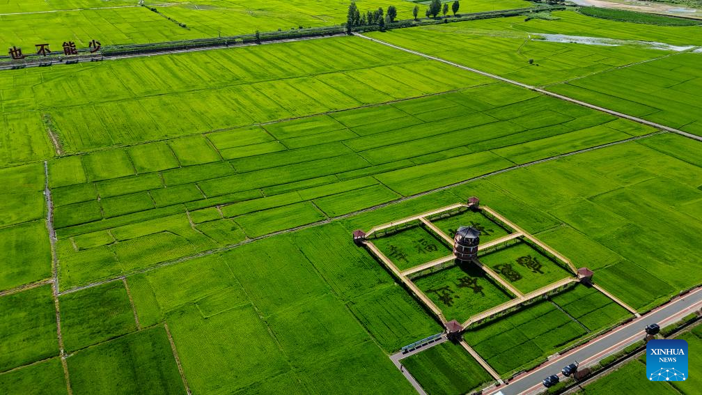 This photo taken on July 18, 2025 shows an organic paddy field in Guangdong Village, Helong City, northeast China's Jilin Province, July 18, 2025. Guangdong, a border village in Jilin Province of northeast China, received over 200,000 visits in 2024, accumulating an income of over 1 million yuan (about 139,317 U.S. dollars). (Xinhua/Shao Zedong)