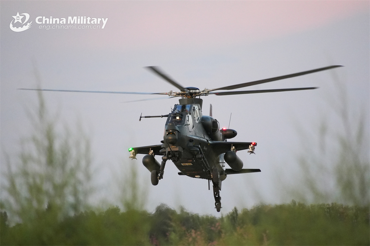 A WZ-10 attack helicopter attached to a brigade under the Chinese PLA Xinjiang Military Command lifts off for a flight training exercise on July 5, 2025. (eng.chinamil.com.cn/Photo by Ji Jiantao)
