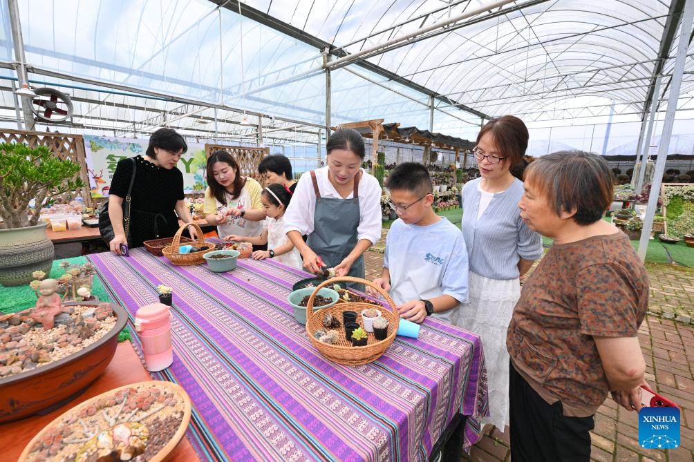 Liu Lin (4th R) instructs children on creating potted succulent plants at the planting base of her company in Zhouning County, southeast China's Fujian Province, July 19, 2025. (Xinhua/Jiang Kehong)
