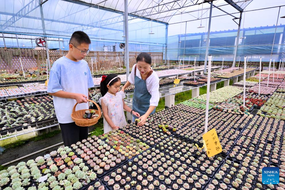 Liu Lin (1st R) helps children select the succulent seedlings at the succulent seedling nursery of her company in Zhouning County, southeast China's Fujian Province, July 19, 2025. (Xinhua/Jiang Kehong)