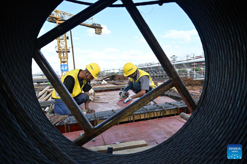 Workers work at the construction site of the Nantong Railway Station in Nantong, east China's Jiangsu Province, July 21, 2025. The station is along a high-speed railway linking Shanghai, Nanjing of Jiangsu Province and Hefei of Anhui Province in east China. (Xinhua/Ji Chunpeng)