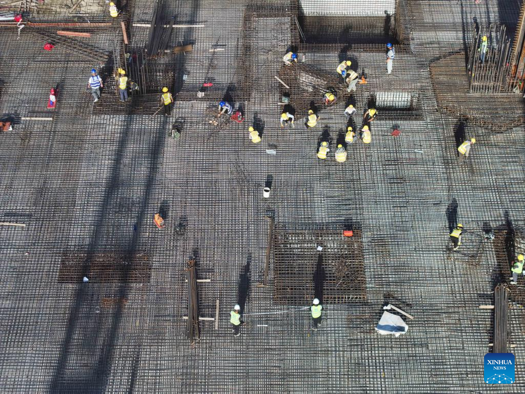 An aerial drone photo shows workers working at the construction site of the Nantong Railway Station in Nantong, east China's Jiangsu Province, July 21, 2025. The station is along a high-speed railway linking Shanghai, Nanjing of Jiangsu Province and Hefei of Anhui Province in east China. (Xinhua/Ji Chunpeng)