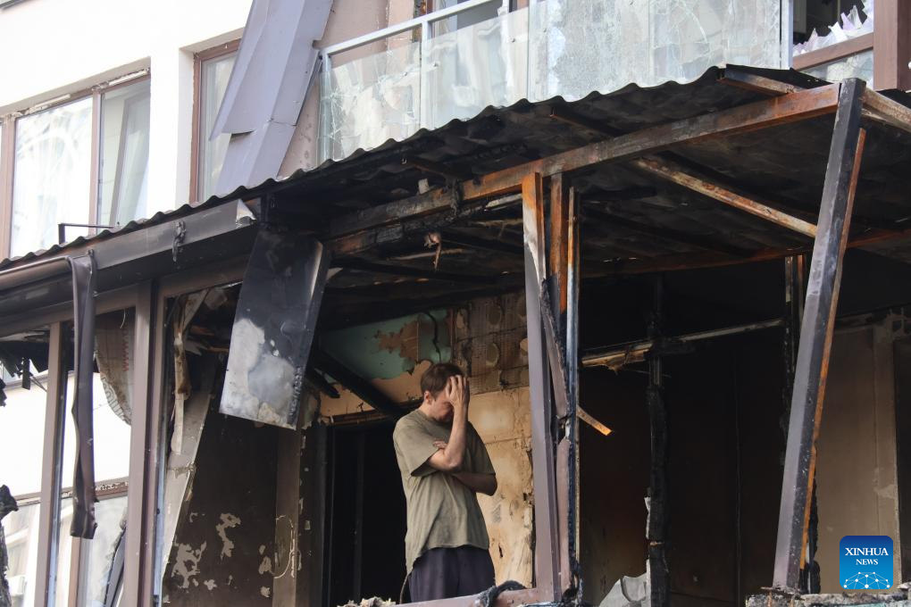 A man makes a phone call on the balcony of a damaged residential building in the Shevchenkivskyi district of Kiev, Ukraine, July 21, 2025. Two people were killed and 15 others injured in a wave of Russian missile and drone strikes on Ukraine's capital and the western region of Ivano-Frankivsk early Monday, said Ukrainian authorities.