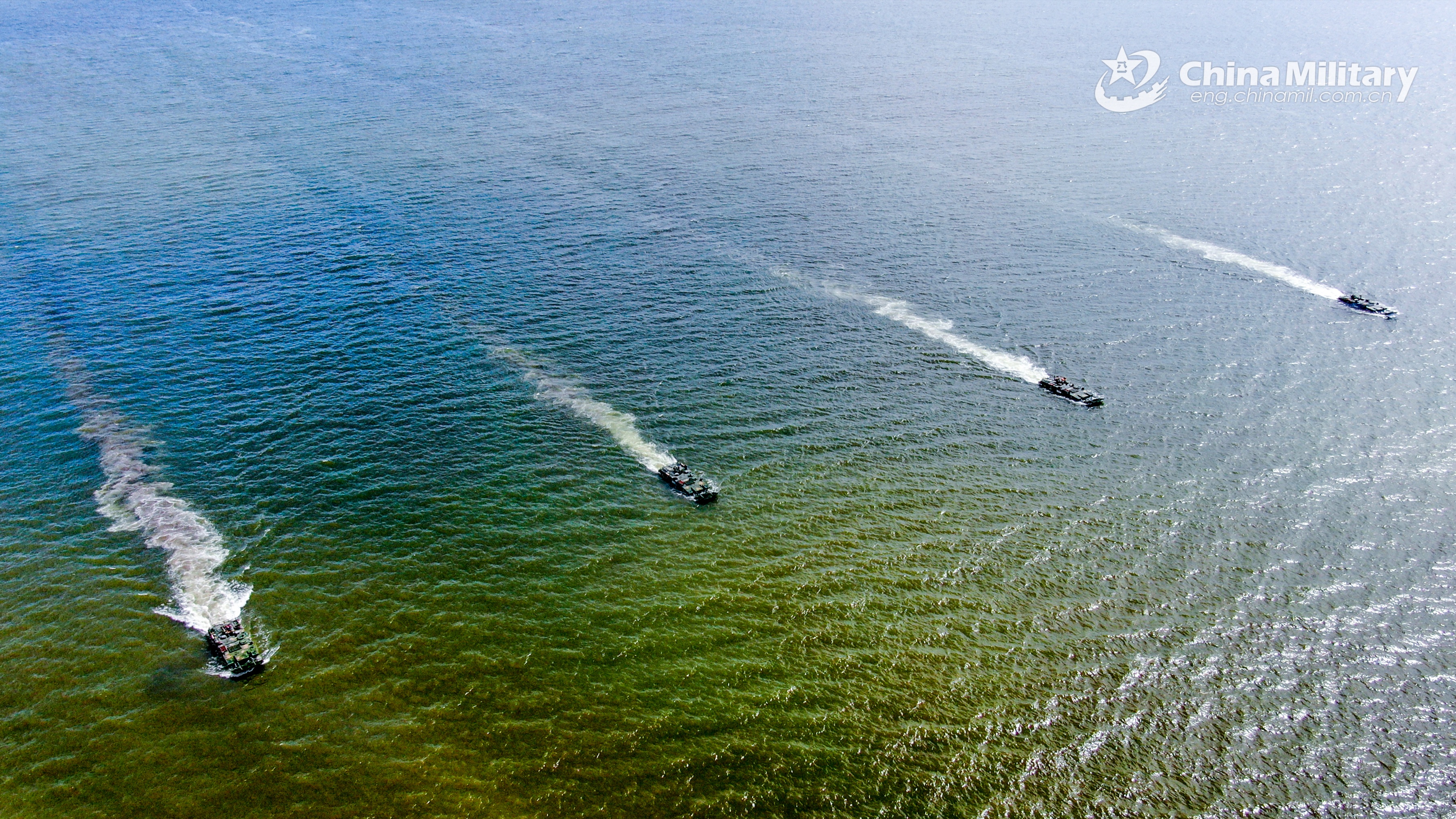 Amphibious armored infantry fighting vehicles (IFV) attached to a brigade with the Chinese PLA Army maneuver towards the designated area during a ferrying and assault wave formation training exercise on July 6, 2025. (eng.chinamil.com.cn/Photo by Zhang Mao)