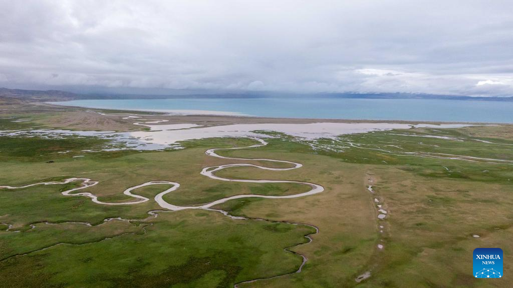 This aerial drone photo taken on July 22, 2025 shows the scenery of a wetland near Mapam Yumco Lake in Burang County of Ngari Prefecture, southwest China's Xizang Autonomous Region. (Xinhua/Tenzing Nima Qadhup)