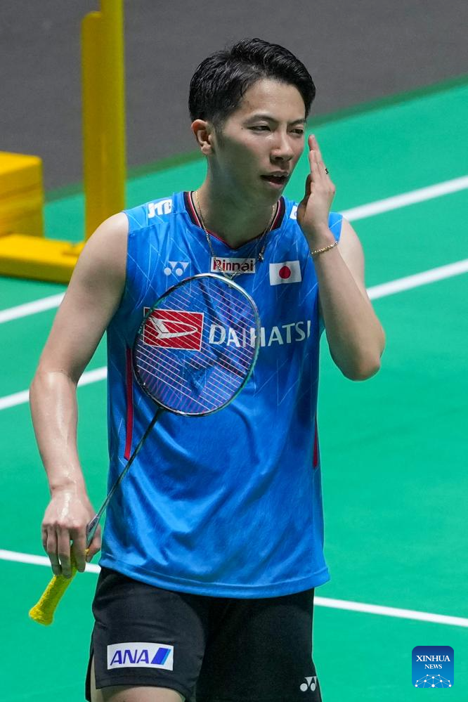 Watanabe Koki of Japan reacts during the men's singles round of 32 match between Watanabe Koki of Japan and Prannoy Haseena Sunil Kumar of India at the China Open 2025 badminton tournament in Changzhou, east China's Jiangsu Province, July 22, 2025. (Xinhua/Li Bo)