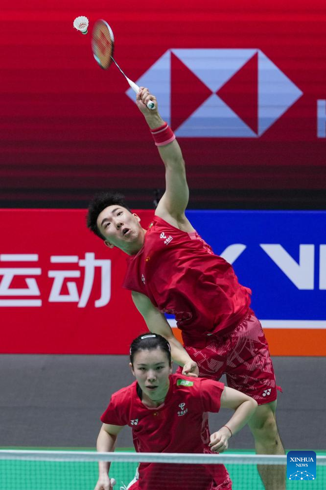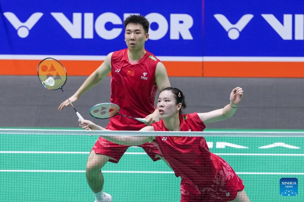 Guo Xinwa/Chen Fanghui (R) of China compete during the mixed doubles round of 32 match between Guo Xinwa/Chen Fanghui of China and Jesper Toft/Amalie Magelund of Denmark at the China Open 2025 badminton tournament in Changzhou, east China's Jiangsu Province, July 22, 2025. (Xinhua/Li Bo)