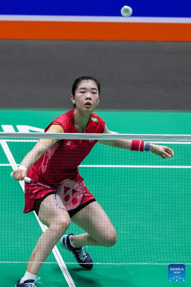 Han Yue of China competes during the women's singles round of 32 match between Han Yue of China and Nidaira Natsuki of Japan at the China Open 2025 badminton tournament in Changzhou, east China's Jiangsu Province, July 22, 2025. (Xinhua/Li Bo)