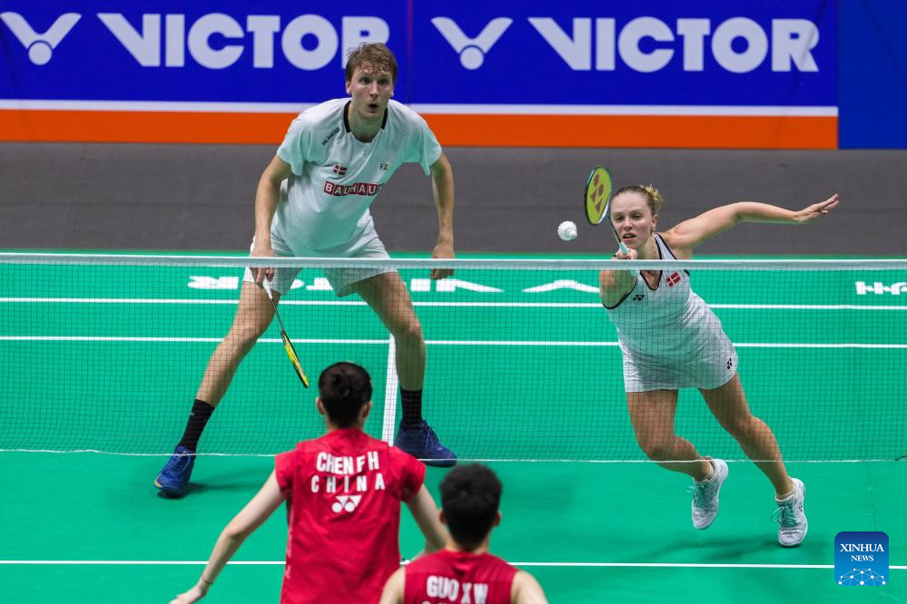 Jesper Toft/Amalie Magelund (R) of Denmark compete during the mixed doubles round of 32 match between Guo Xinwa/Chen Fanghui of China and Jesper Toft/Amalie Magelund of Denmark at the China Open 2025 badminton tournament in Changzhou, east China's Jiangsu Province, July 22, 2025. (Xinhua/Li Bo)