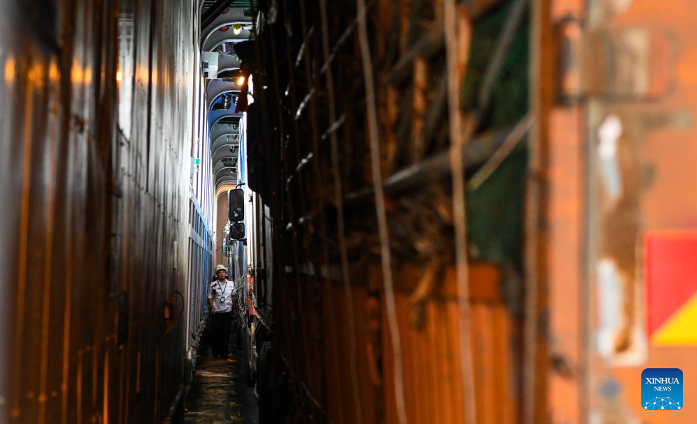 Maritime staff work on a ferry ship at Xiuying Port in Haikou, south China's Hainan Province, July 22, 2025. The passenger and freight ferry service in the Qiongzhou Strait has been resumed in an orderly manner as the impact of Typhoon Wipha weakens. (Xinhua/Yang Guanyu)