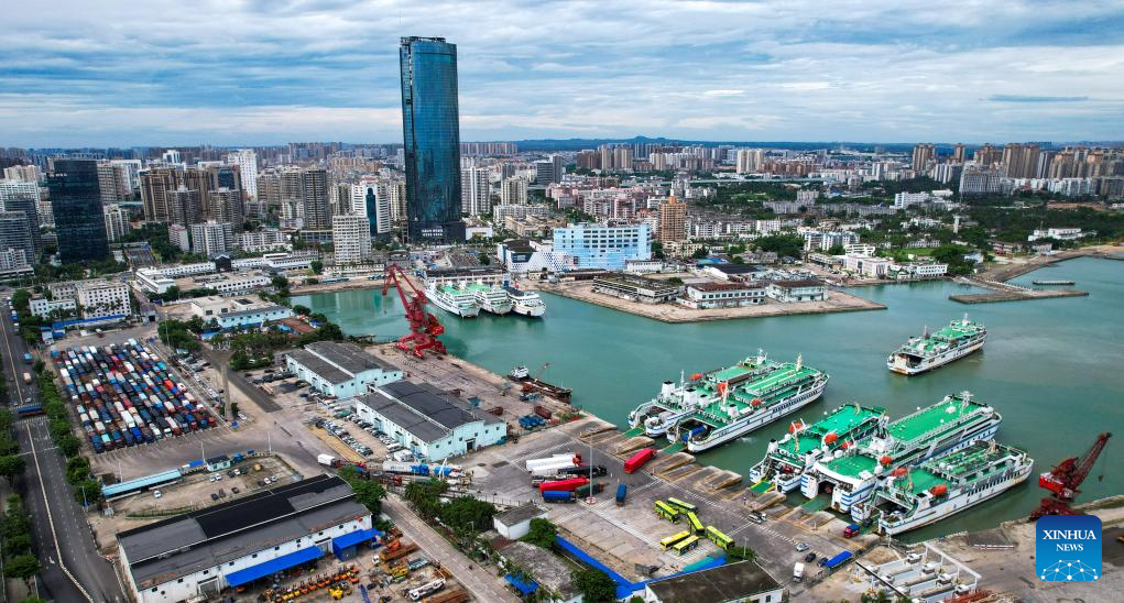 An aerial drone photo taken on July 22, 2025 shows a view of Xiuying Port in Haikou, south China's Hainan Province. The passenger and freight ferry service in the Qiongzhou Strait has been resumed in an orderly manner as the impact of Typhoon Wipha weakens. (Xinhua/Yang Guanyu)