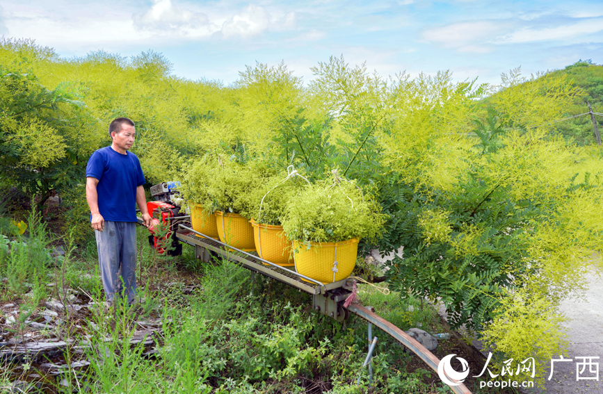 Harvested golden Chinese scholar tree flowers are transported via a transport facility at a family farm in Baibao township, Quanzhou county, Guilin city, south China's Guangxi Zhuang Autonomous Region. (Photo/People's Daily Online)