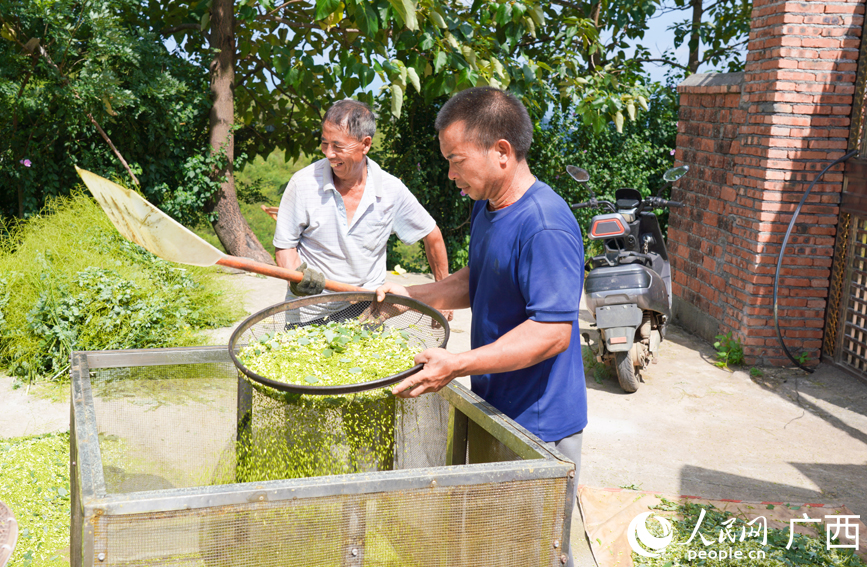 Farmers process golden Chinese scholar tree flowers in Baibao township, Quanzhou county, Guilin city, south China's Guangxi Zhuang Autonomous Region. (Photo/People's Daily Online)