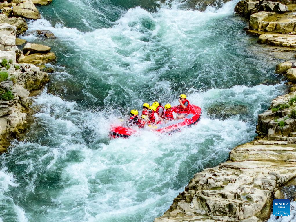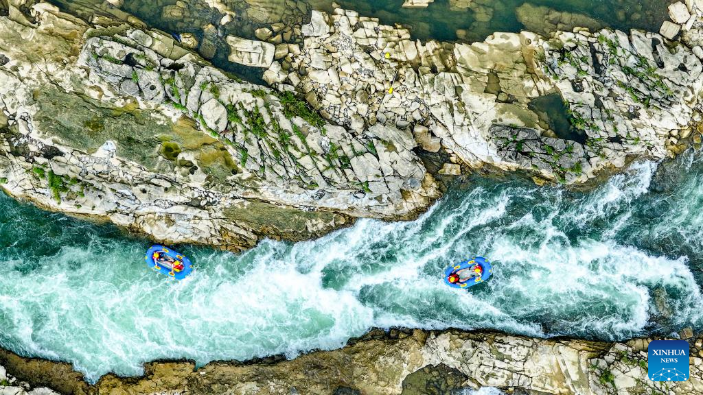 This photo taken on July 21, 2025 shows people rafting in inflatable boats on Luobei River in Guiding County, southwest China's Guizhou Province. (Xinhua/Ou Dongqu)