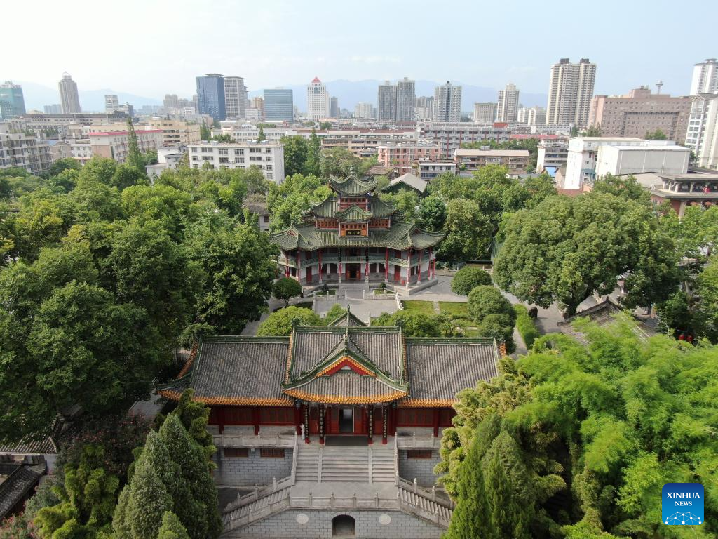 This photo shows the Wuhouci Shrine in Mianxian County in Hanzhong, northwest China's Shaanxi Province, July 22, 2025. Hanzhong is nestled between the Qinling and Daba Mountains, with the Hanjiang River, a tributary of the Yangtze River, flowing through the city. For more than 2,300 years, it has served as a vital nexus for the river network and transportation routes connecting the north and south. The city is rich in resources and, unlike other areas in Shaanxi, it shows distinct characteristics in dialect and culinary traditions influenced by southwest China's Sichuan. (Xinhua/Li Yibo)