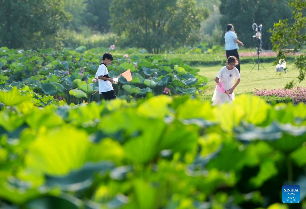 Kids have fun at a wetland park in Hanzhong, northwest China's Shaanxi Province, July 21, 2025. Hanzhong is nestled between the Qinling and Daba Mountains, with the Hanjiang River, a tributary of the Yangtze River, flowing through the city. For more than 2,300 years, it has served as a vital nexus for the river network and transportation routes connecting the north and south. The city is rich in resources and, unlike other areas in Shaanxi, it shows distinct characteristics in dialect and culinary traditions influenced by southwest China's Sichuan. (Xinhua/Li Yibo)