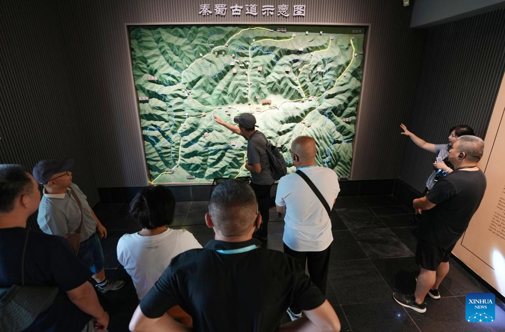 Tourists watch the diagrammatic sketch of ancient routes at the Hanzhong Museum in Hanzhong, northwest China's Shaanxi Province, July 22, 2025. Hanzhong is nestled between the Qinling and Daba Mountains, with the Hanjiang River, a tributary of the Yangtze River, flowing through the city. For more than 2,300 years, it has served as a vital nexus for the river network and transportation routes connecting the north and south. The city is rich in resources and, unlike other areas in Shaanxi, it shows distinct characteristics in dialect and culinary traditions influenced by southwest China's Sichuan. (Xinhua/Li Yibo)