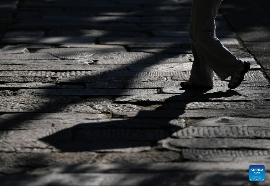 A tourist walks on relics of the ancient path at the Wuhouci Shrine in Mianxian County in Hanzhong, northwest China's Shaanxi Province, July 22, 2025. Hanzhong is nestled between the Qinling and Daba Mountains, with the Hanjiang River, a tributary of the Yangtze River, flowing through the city. For more than 2,300 years, it has served as a vital nexus for the river network and transportation routes connecting the north and south. The city is rich in resources and, unlike other areas in Shaanxi, it shows distinct characteristics in dialect and culinary traditions influenced by southwest China's Sichuan. (Xinhua/Li Yibo)