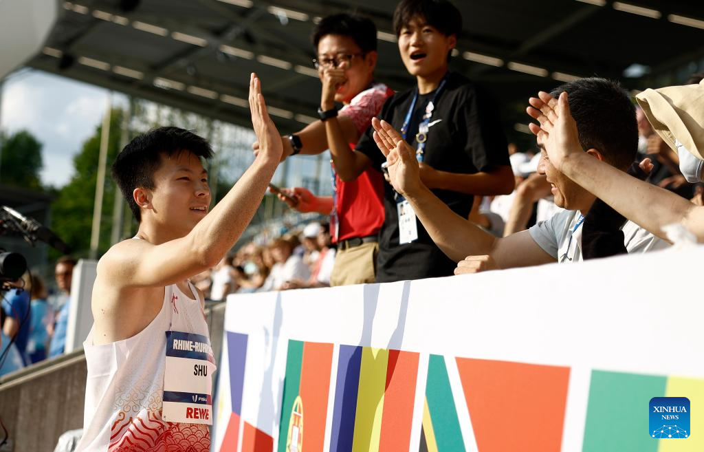 Shu Heng (C) of China celebrates after the men's long jump final at the Rhine-Ruhr 2025 FISU World University Games in Bochum, Germany, July 24, 2025. (Xinhua/Hu Xingyu)