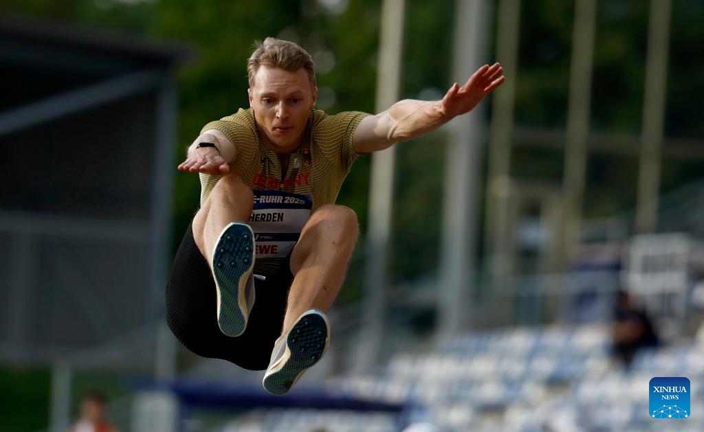 Luka Herden of Germany competes during the men's long jump final at the Rhine-Ruhr 2025 FISU World University Games in Bochum, Germany, July 24, 2025. (Xinhua/Hu Xingyu)