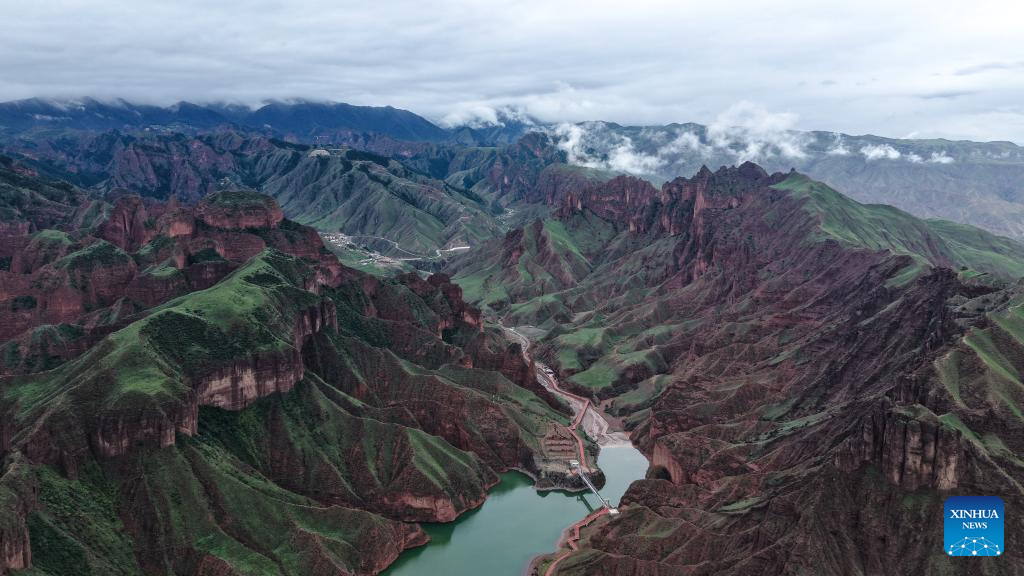 An aerial drone photo taken on July 24, 2025 shows a view of the Kanbula National Geopark in Huangnan Tibetan Autonomous Prefecture, northwest China's Qinghai Province. Nestled on the northeastern edge of the Qinghai-Tibet Plateau, the Kanbula National Geopark spans roughly 3,149 square kilometers with striking fiery-red Danxia landforms, towering jagged peaks, hidden caves and emerald lakes. Beyond its visual splendor, the park's true value lies beneath the surface, serving as a premier location for geoscientific research and public science education. (Xinhua/Wang Yan)