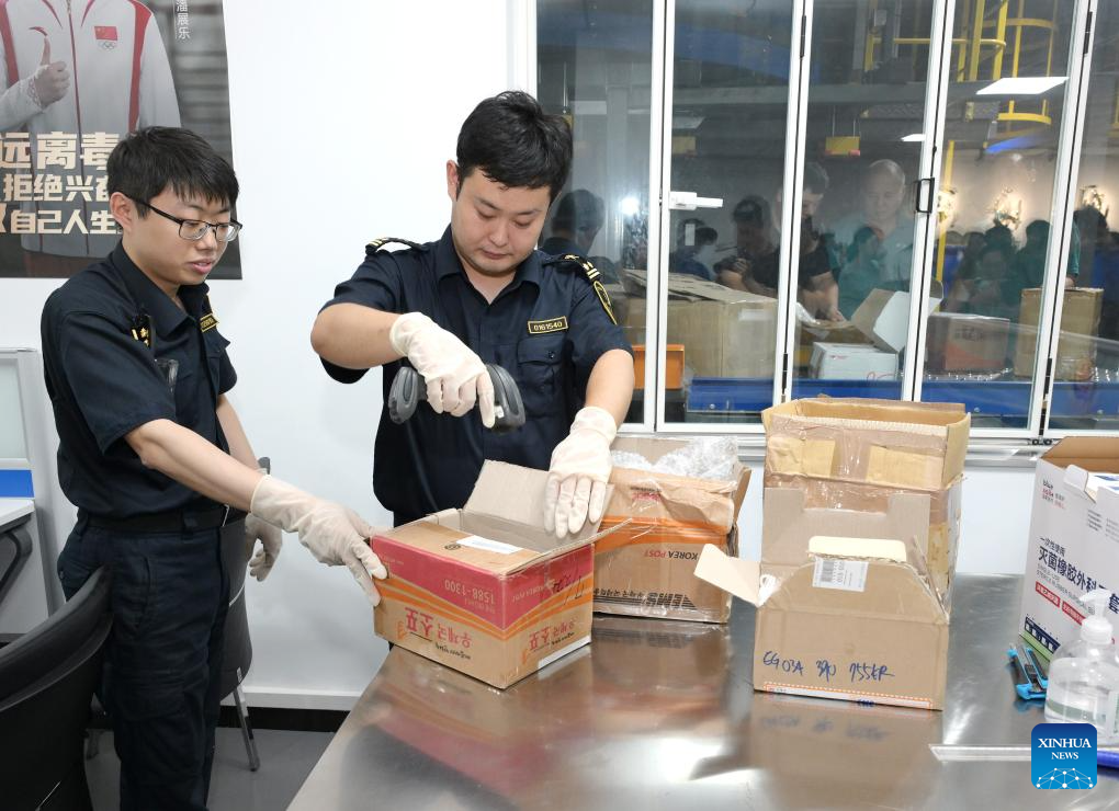 Staff members of Beijing Customs inspect suspicious parcels in Beijing, capital of China, July 25, 2025. Problems of counterfeiting and intellectual property (IP) infringement have become increasingly prominent as Chinese cultural and creative products gain growing influence in the world market.