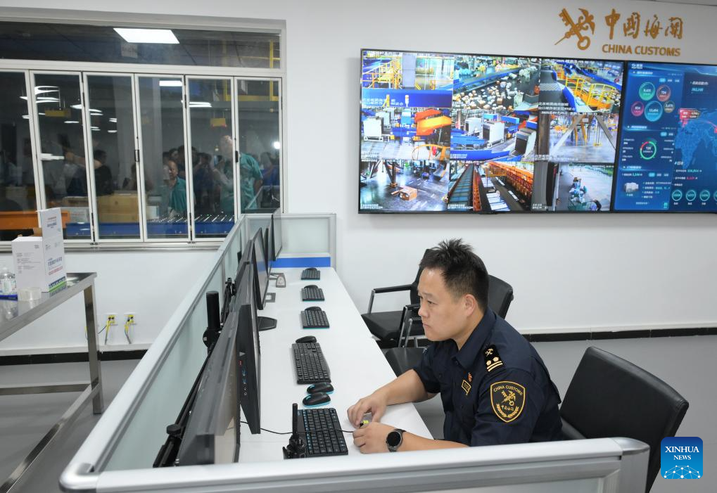A staff member of Beijing Customs checks suspicious mails on the screen of a monitor system in Beijing, capital of China, July 25, 2025. Problems of counterfeiting and intellectual property (IP) infringement have become increasingly prominent as Chinese cultural and creative products gain growing influence in the world market.