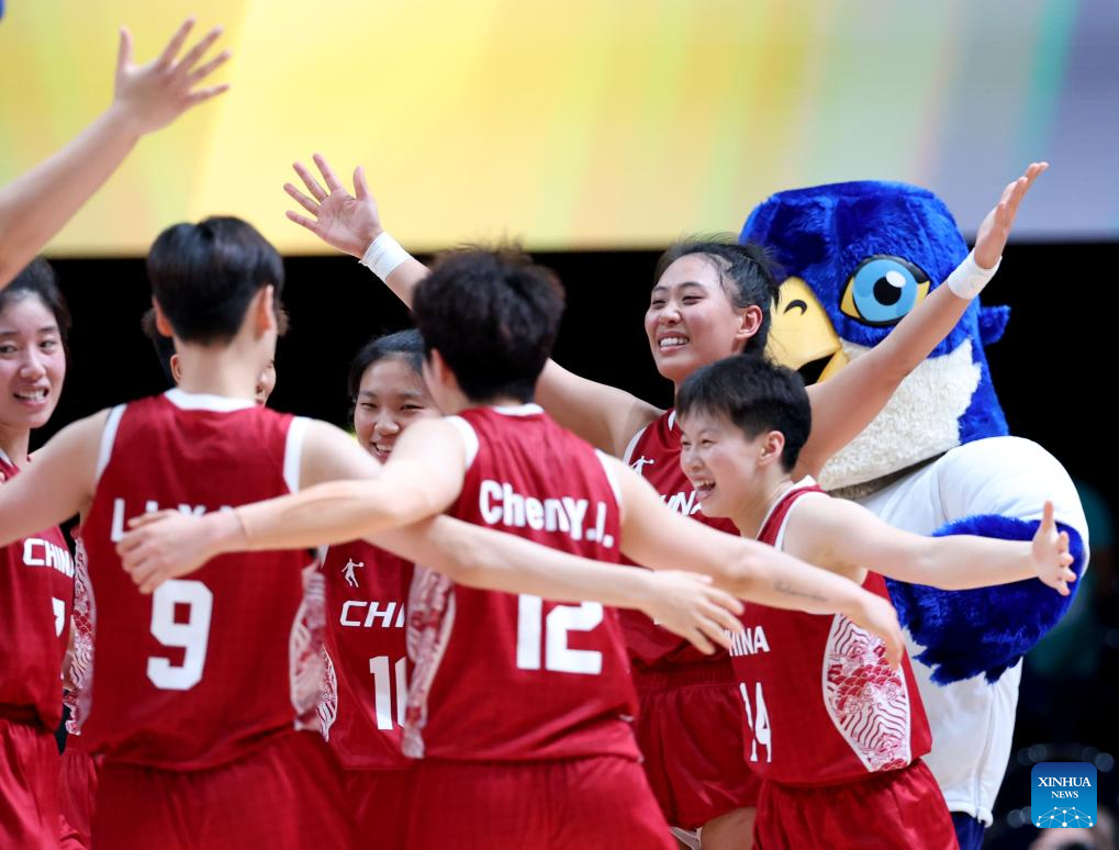 Players of team China celebrate during the women's basketball final between China and the United States at the Rhine-Ruhr 2025 FISU World University Games in Essen, Germany, July 25, 2025. (Xinhua/Zhang Chen)