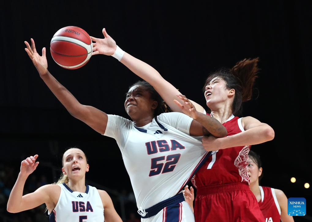 Deyona Mae Gaston (2nd R) of the United States fights for a rebound during the women's basketball final between China and the United States at the Rhine-Ruhr 2025 FISU World University Games in Essen, Germany, July 25, 2025. (Xinhua/Zhang Chen)
