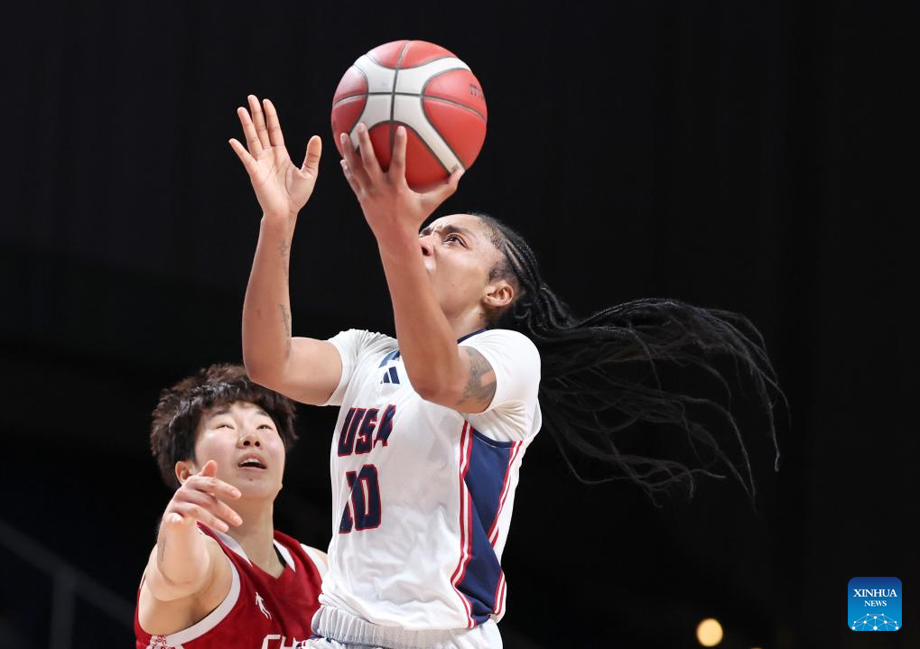 Liu Yutong (3rd R) of China goes to basket during the women's basketball final between China and the United States at the Rhine-Ruhr 2025 FISU World University Games in Essen, Germany, July 25, 2025. (Xinhua/Zhang Fan)