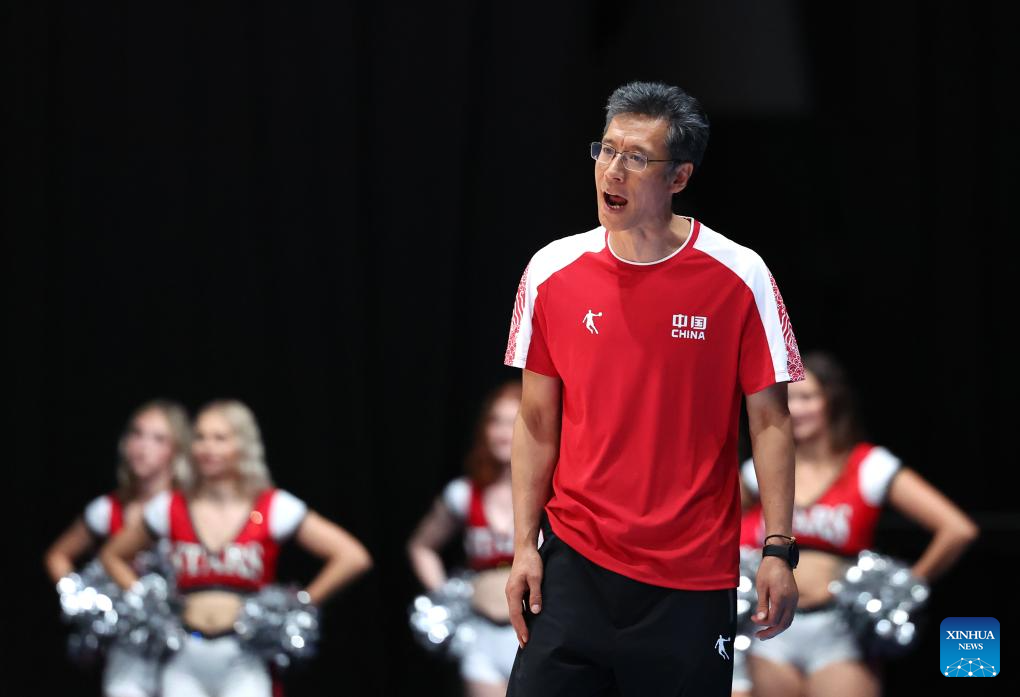 Li Sunnan, head coach of team China, reacts during the women's basketball final between China and the United States at the Rhine-Ruhr 2025 FISU World University Games in Essen, Germany, July 25, 2025. (Xinhua/Zhang Chen)