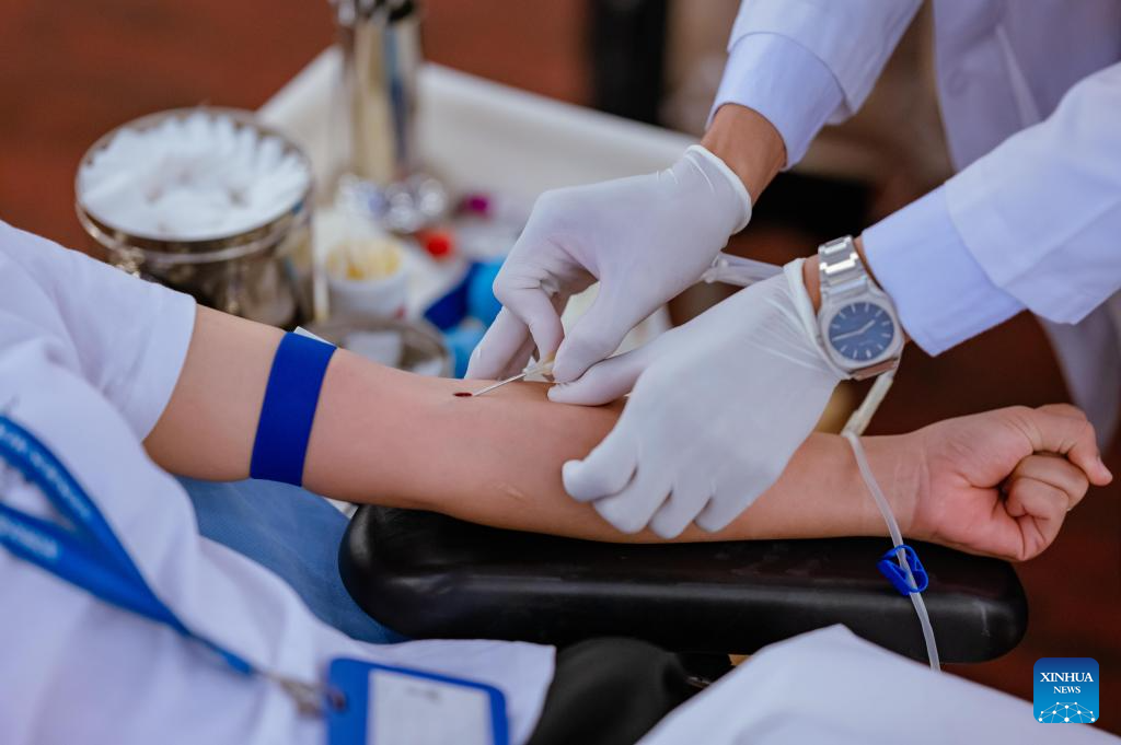 Cambodian people donate blood in Phnom Penh, Cambodia, July 25, 2025. The blood donation was made amid border clashes between Cambodian and Thai soldiers. Cambodia's Oddar Meanchey deputy governor, Met Meas Pheakdey, told Xinhua over the telephone that one villager was killed and five others were wounded on Thursday when the Thai side fired artillery shells into Cambodian territory. Blood donation is organized amid border clashes between Cambodian and Thai soldiers. (Photo by Sovannara/Xinhua)