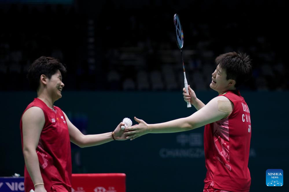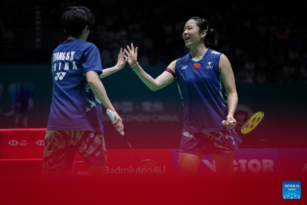 Jia Yifan (R)/Zhang Shuxian of China celebrate during the women's doubles final match between Liu Shengshu/Tan Ning of China and Jia Yifan/Zhang Shuxian of China at the China Open 2025 badminton tournament in Changzhou, east China's Jiangsu Province, July 27, 2025. (Xinhua/Li Bo)