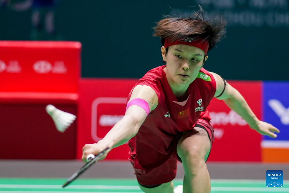 Han Yue of China competes during the women's singles final match between Wang Zhiyi of China and Han Yue of China at the China Open 2025 badminton tournament in Changzhou, east China's Jiangsu Province, July 27, 2025. (Xinhua/Li Bo)