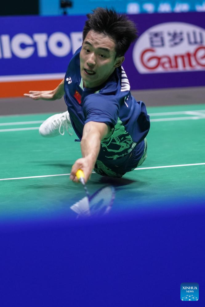 Wang Zhengxing of China competes during the men's singles final match between Shi Yuqi of China and Wang Zhengxing of China at the China Open 2025 badminton tournament in Changzhou, east China's Jiangsu Province, July 27, 2025. (Xinhua/Li Bo)