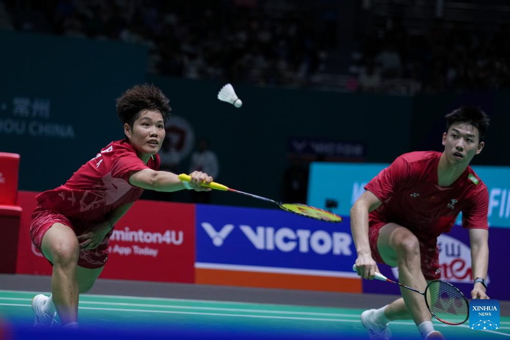 Jiang Zhenbang/Wei Yaxin (front) of China compete during the mixed doubles final between Feng Yanzhe/Huang Dongping of China and Jiang Zhenbang/Wei Yaxin of China at the China Open 2025 badminton tournament in Changzhou, east China's Jiangsu Province, July 27, 2025. (Xinhua/Li Bo)
