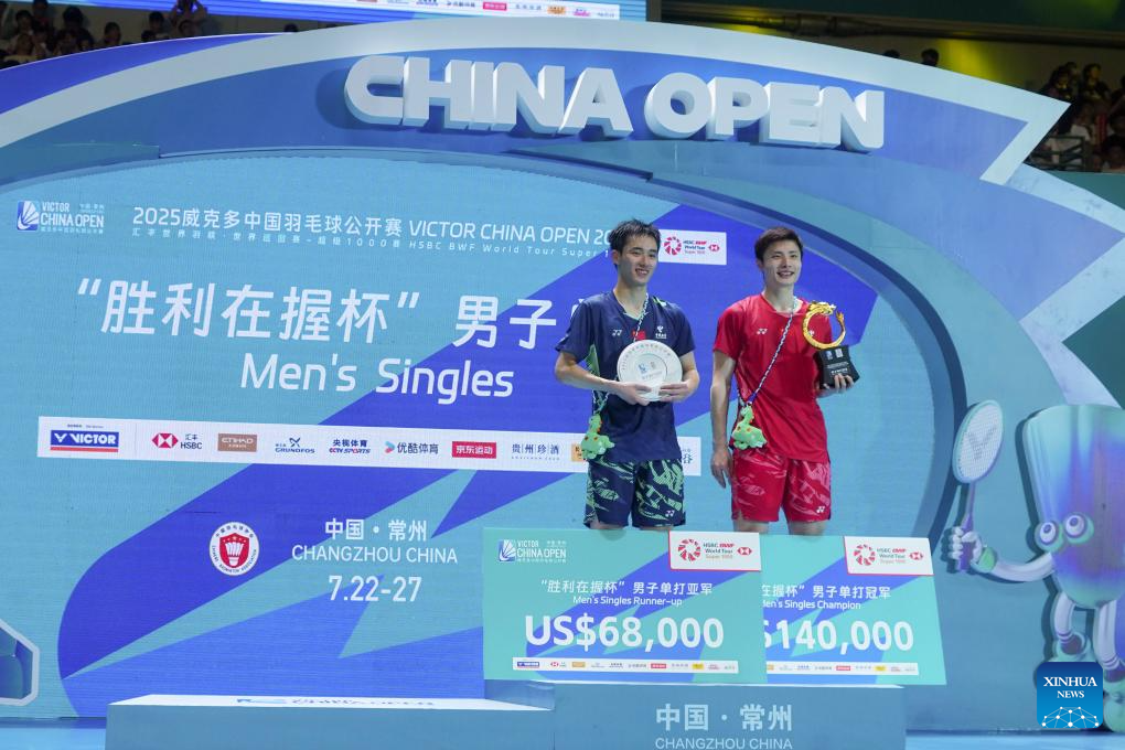 Shi Yuqi of China poses for photos during the awarding ceremony for the men's singles match between Shi Yuqi of China and Wang Zhengxing of China at the China Open 2025 badminton tournament in Changzhou, east China's Jiangsu Province, July 27, 2025. (Photo by Liu Zhenrui/Xinhua)