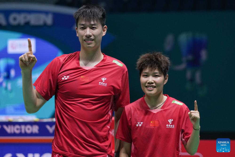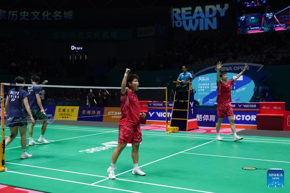 Feng Yanzhe/Huang Dongping (2nd R) of China celebrate after the mixed doubles final between Feng Yanzhe/Huang Dongping of China and Jiang Zhenbang/Wei Yaxin of China at the China Open 2025 badminton tournament in Changzhou, east China's Jiangsu Province, July 27, 2025. (Xinhua/Li Bo)