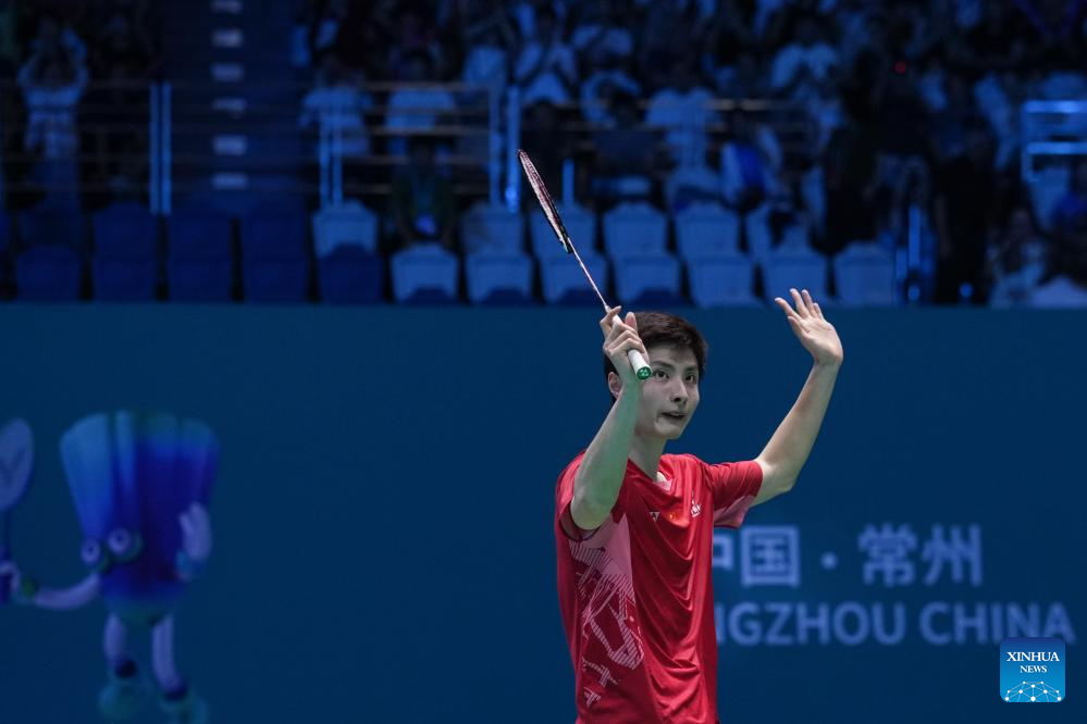 Shi Yuqi of China reacts with the audience after the men's singles final match between Shi Yuqi of China and Wang Zhengxing of China at the China Open 2025 badminton tournament in Changzhou, east China's Jiangsu Province, July 27, 2025. (Xinhua/Li Bo)