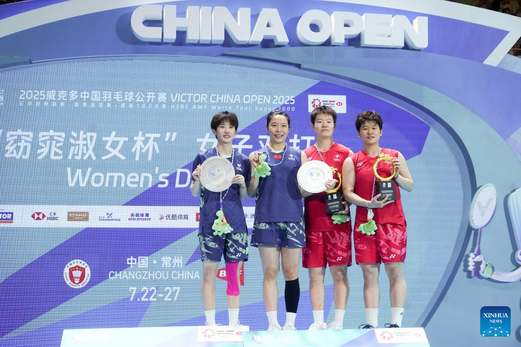 Liu Shengshu (2nd R) /Tan Ning (1st R) of China celebrate with the trophies after winning against Jia Yifan/Zhang Shuxian (1st L) of China during the awarding ceremony for the women's doubles at the China Open 2025 badminton tournament in Changzhou, east China's Jiangsu Province, July 27, 2025. (Photo by Liu Zhenrui/Xinhua)