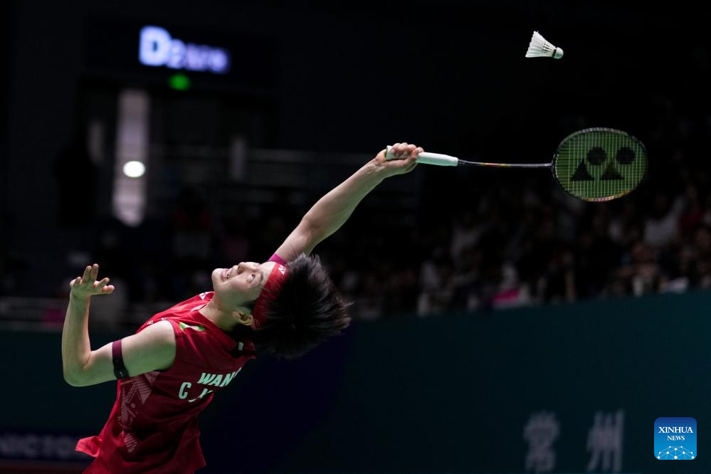 Wang Zhiyi of China competes during the women's singles final match between Wang Zhiyi of China and Han Yue of China at the China Open 2025 badminton tournament in Changzhou, east China's Jiangsu Province, July 27, 2025. (Xinhua/Li Bo)