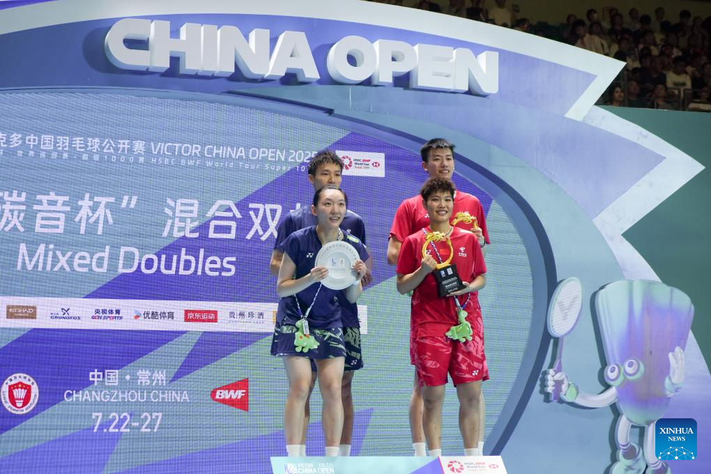 Winners Feng Yanzhe (top R) /Huang Dongping (bottom R) of China and runners-up Jiang Zhenbang (top L) /Wei Yaxin of China pose for photos during the awarding ceremony for the mixed doubles between Feng Yanzhe/Huang Dongping of China and Jiang Zhenbang/Wei Yaxin of China at the China Open 2025 badminton tournament in Changzhou, east China's Jiangsu Province, July 27, 2025. (Photo by Liu Zhenrui/Xinhua)
