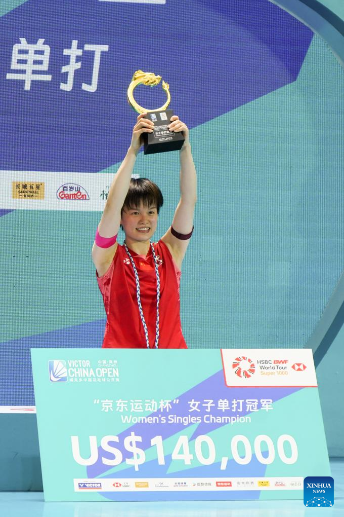 Winner Wang Zhiyi of China reacts during the awarding ceremony for the women's singles match between Wang Zhiyi of China and Han Yue of China at the China Open 2025 badminton tournament in Changzhou, east China's Jiangsu Province, July 27, 2025. (Photo by Liu Zhenrui/Xinhua)