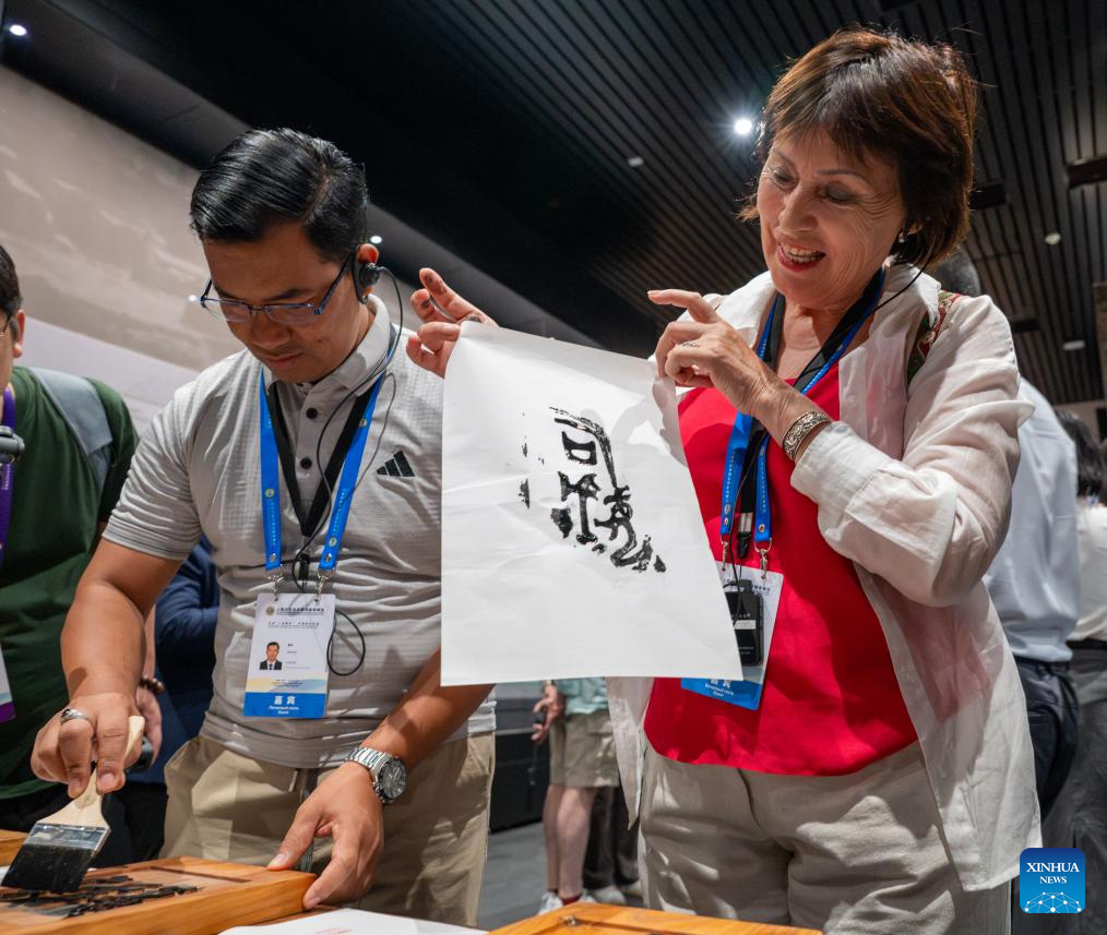 Participants of the Shanghai Cooperation Organization (SCO) Media and Think Tank Summit learn about rubbing at Yinxu Museum in Anyang, central China's Henan Province, July 26, 2025. The SCO Media and Think Tank Summit is held in Zhengzhou from July 23 to 27. Participants are invited to visit various locations in Henan during the summit. (Xinhua/Hu Jingwen)