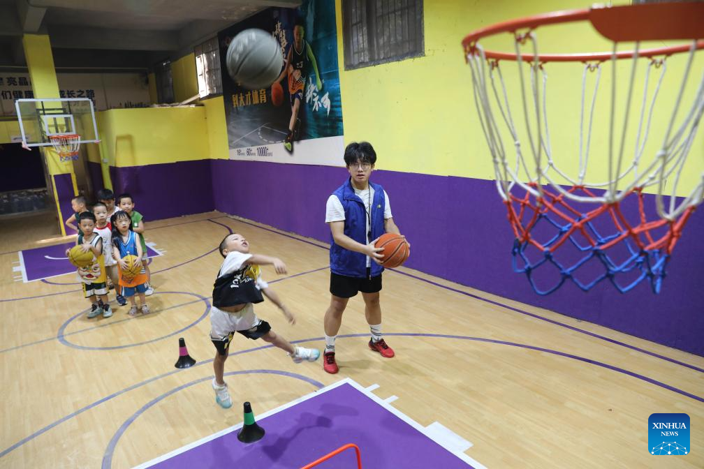 Children practice basketball skills in Yongzhou City, central China's Hunan, July 26, 2025. Children participate in various activities during summer vacation across the country. (Photo by He Hongfu/Xinhua)