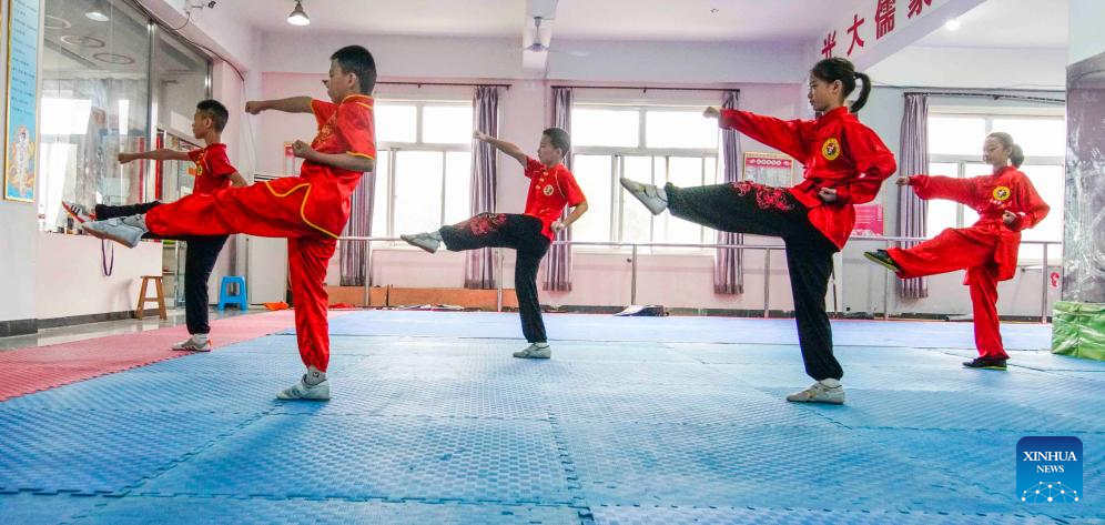 Children practice Chinese martial art in Zunhua, north China's Hebei, July 26, 2025. Children participate in various activities during summer vacation across the country. (Photo by Liu Mancang/Xinhua)