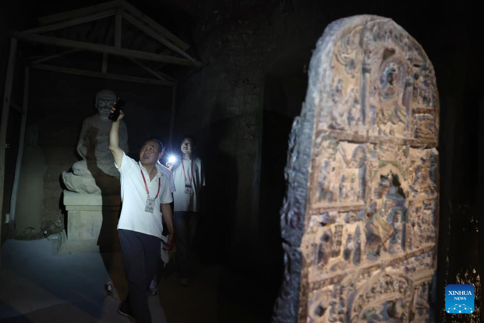 Mu Changyou (front), a cultural relics restorer of Maiji Mountain Grottoes art institute, checks statues and murals at a cave of the Grottoes in Tianshui City, northwest China's Gansu Province on July 16, 2025. (Xinhua/Chen Bin)