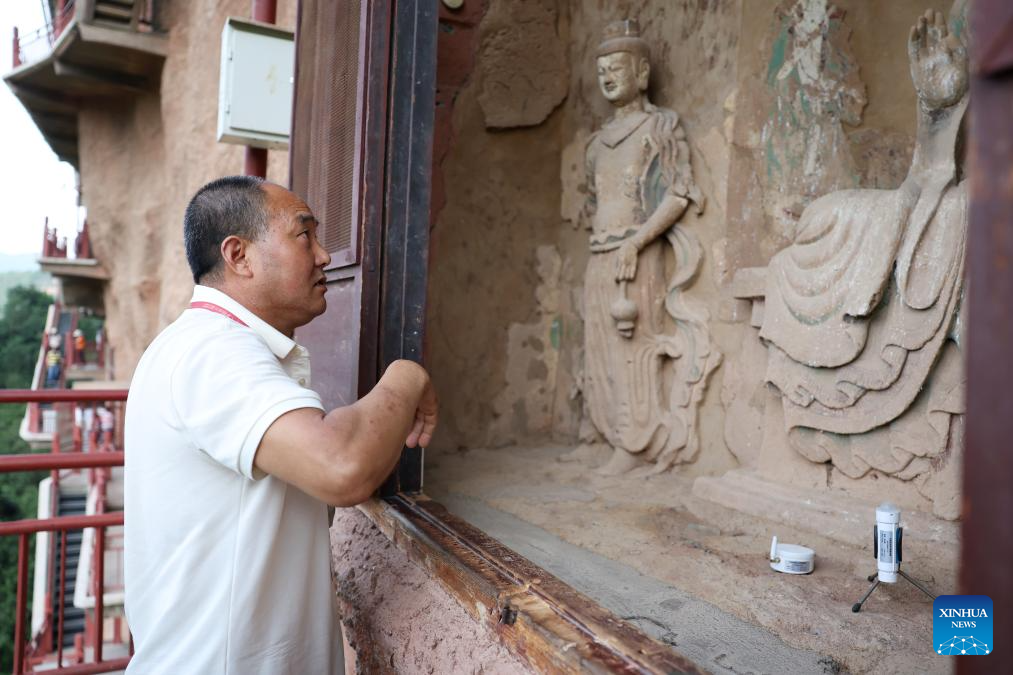Mu Changyou, a cultural relics restorer of Maiji Mountain Grottoes art institute, checks a statue at a cave of the Grottoes in Tianshui City, northwest China's Gansu Province on July 16, 2025. (Xinhua/Chen Bin)