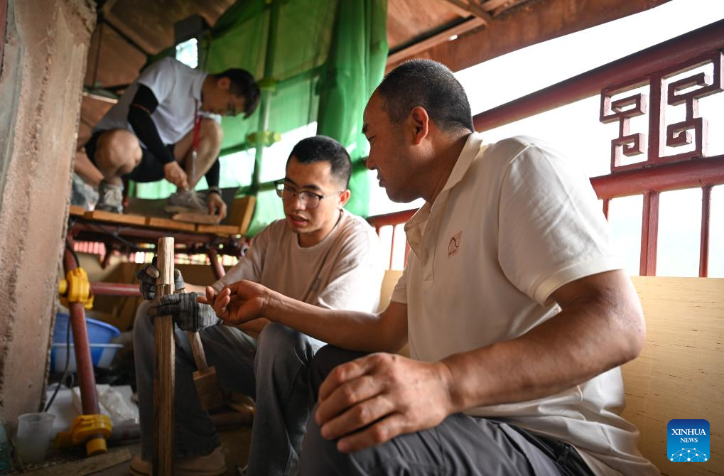 Mu Changyou (1st R), a cultural relics restorer of Maiji Mountain Grottoes art institute, guides his apprentice at a cave of the Grottoes in Tianshui City, northwest China's Gansu Province on July 16, 2025. (Xinhua/Cai Xiangxin)