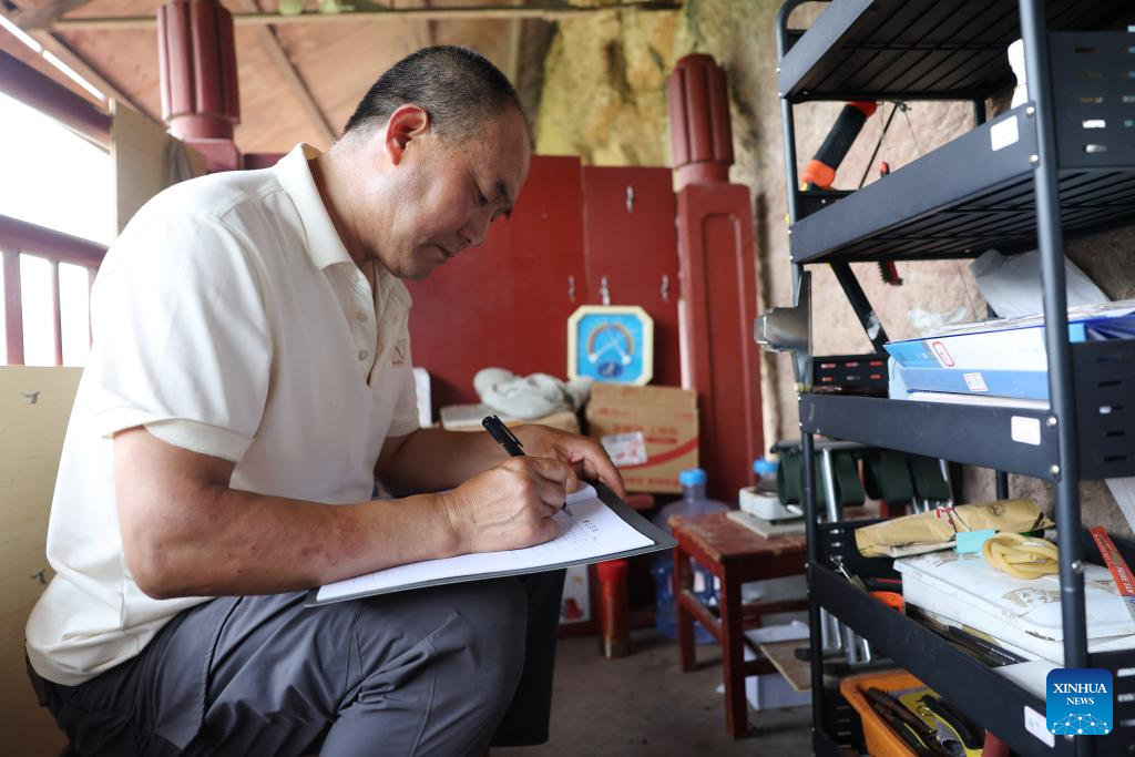 Mu Changyou, a cultural relics restorer of Maiji Mountain Grottoes art institute, fills out a logbook for restoration work at a cave of the Grottoes in Tianshui City, northwest China's Gansu Province on July 16, 2025. (Xinhua/Chen Bin)